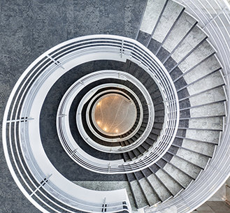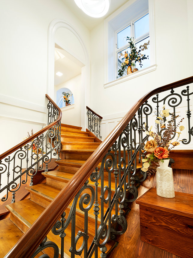 受付の上の6階は、建物の見事で壮大な吹き抜けになっています。 デザインは、複雑なリーフパターンが並んだ螺旋階段など、セコイアの意匠化です。